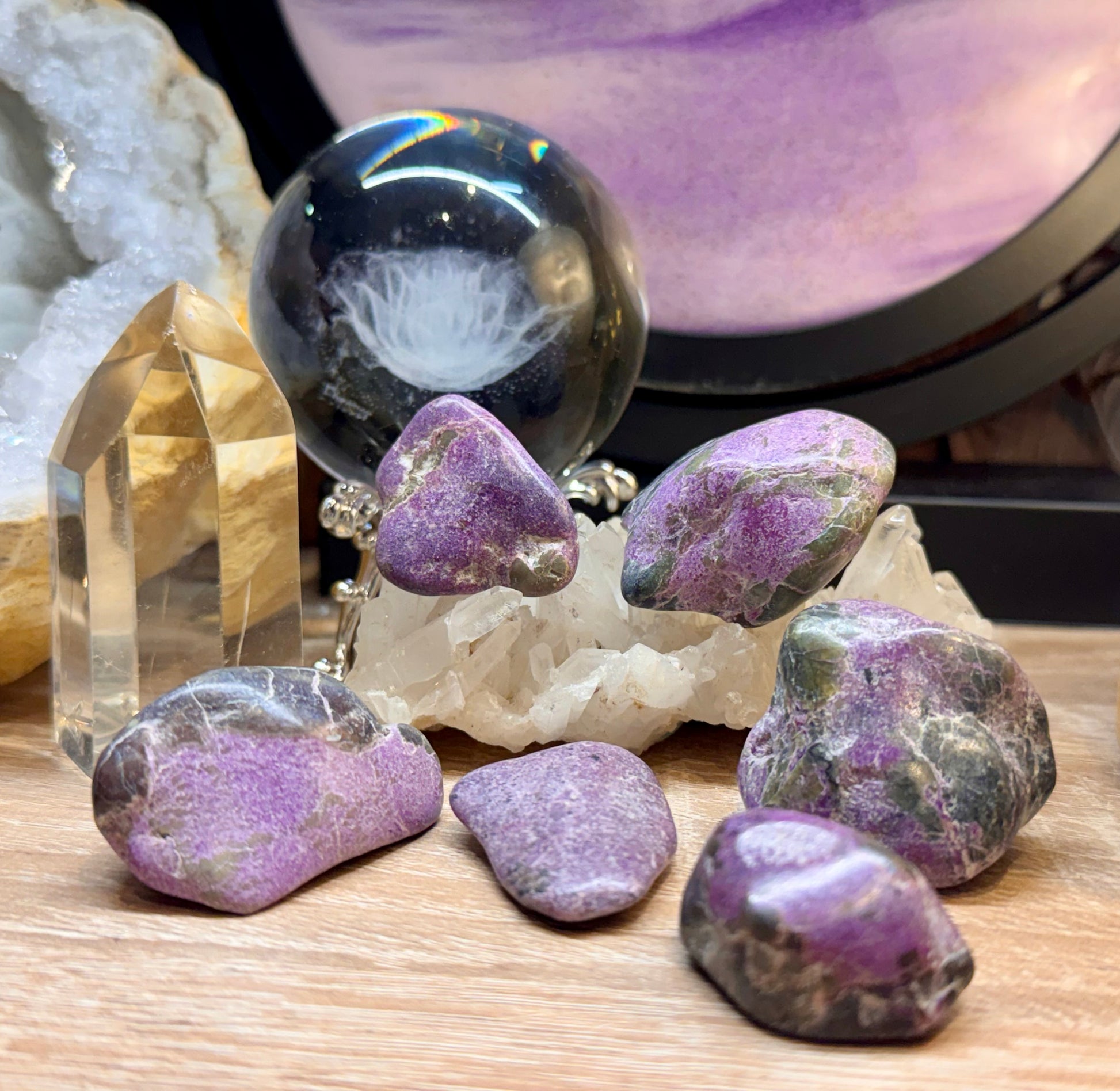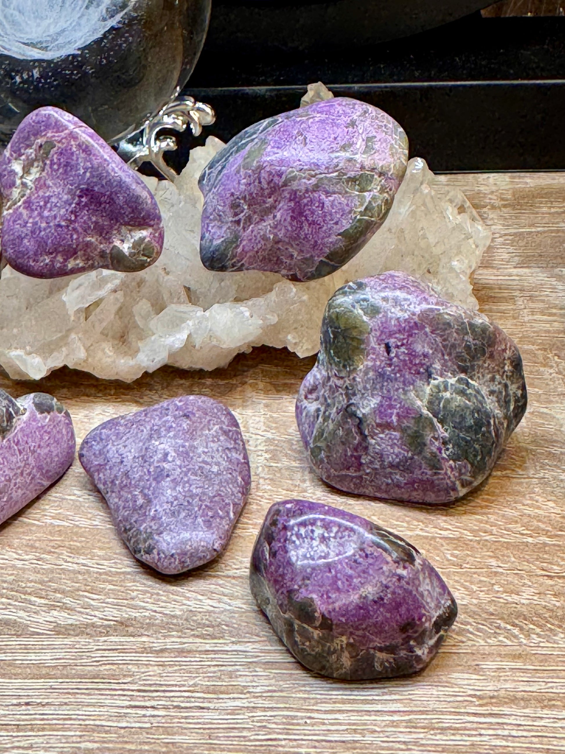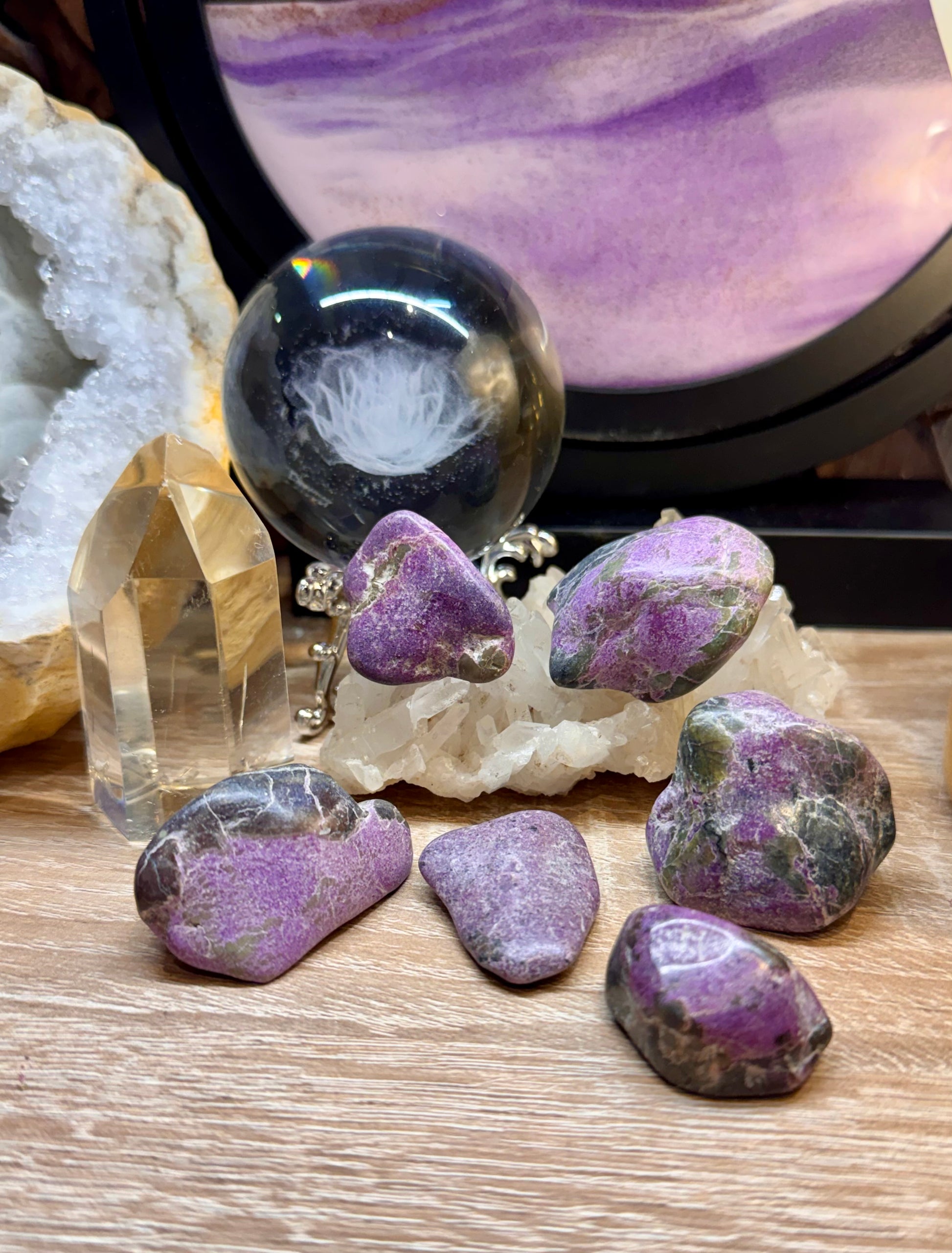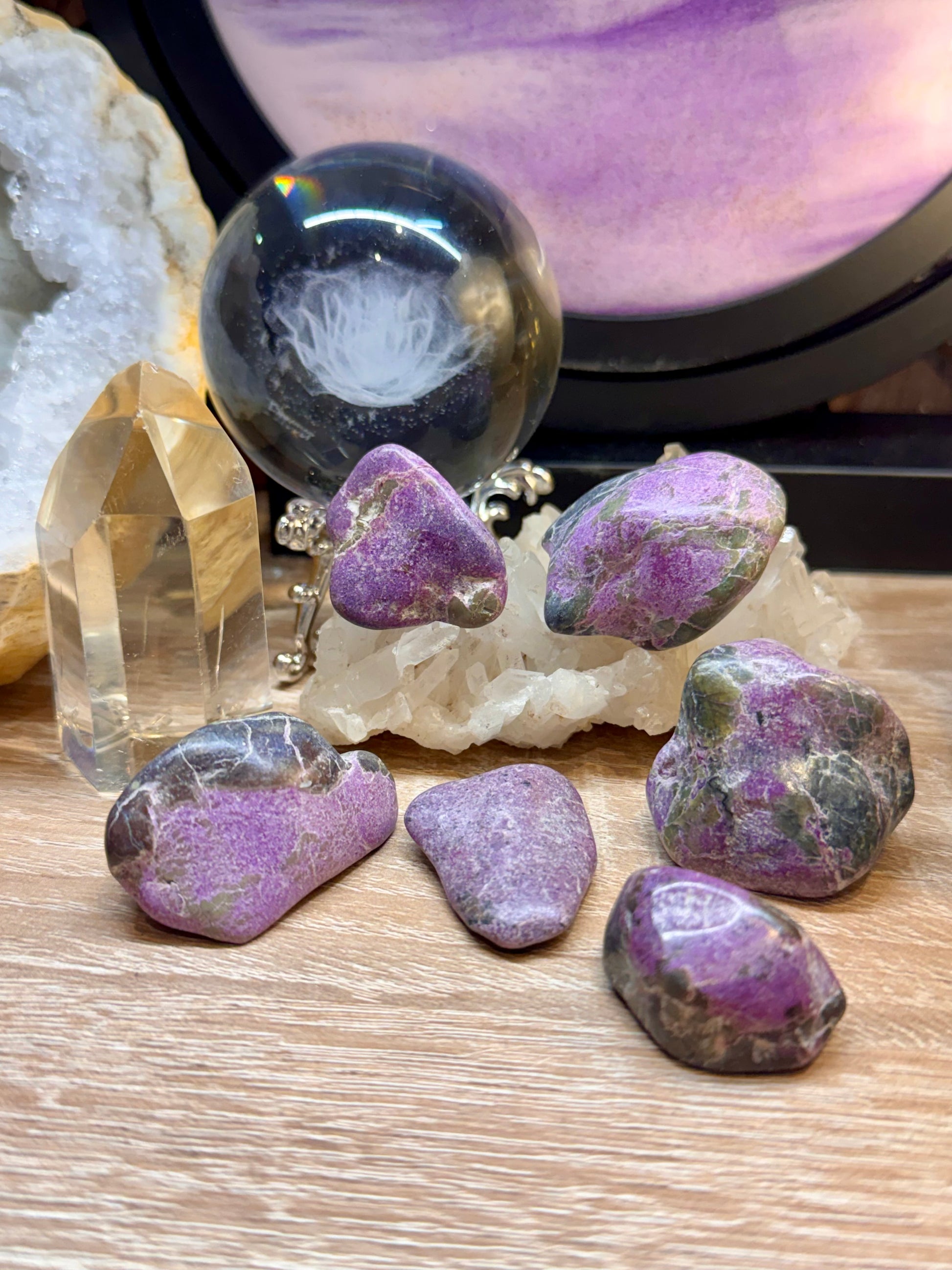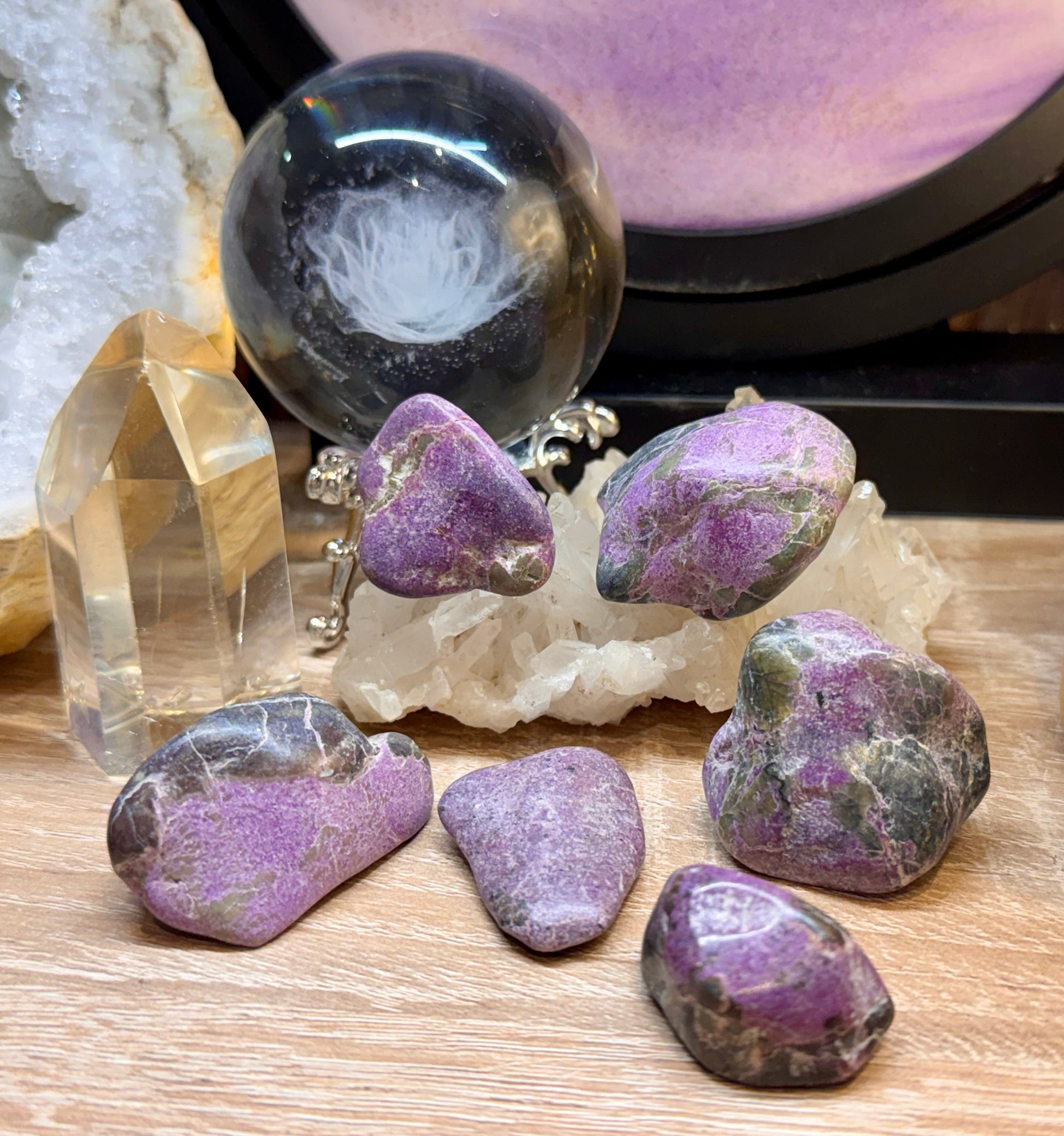 L’Atlantisite est le nom donné à cette belle combinaison de serpentine verte avec des inclusions de stichtite rose à violet, en tant que tel, il se mêle ainsi aux propriétés de ces deux minéraux, mais a tout de même ses propriétés bien à elle.