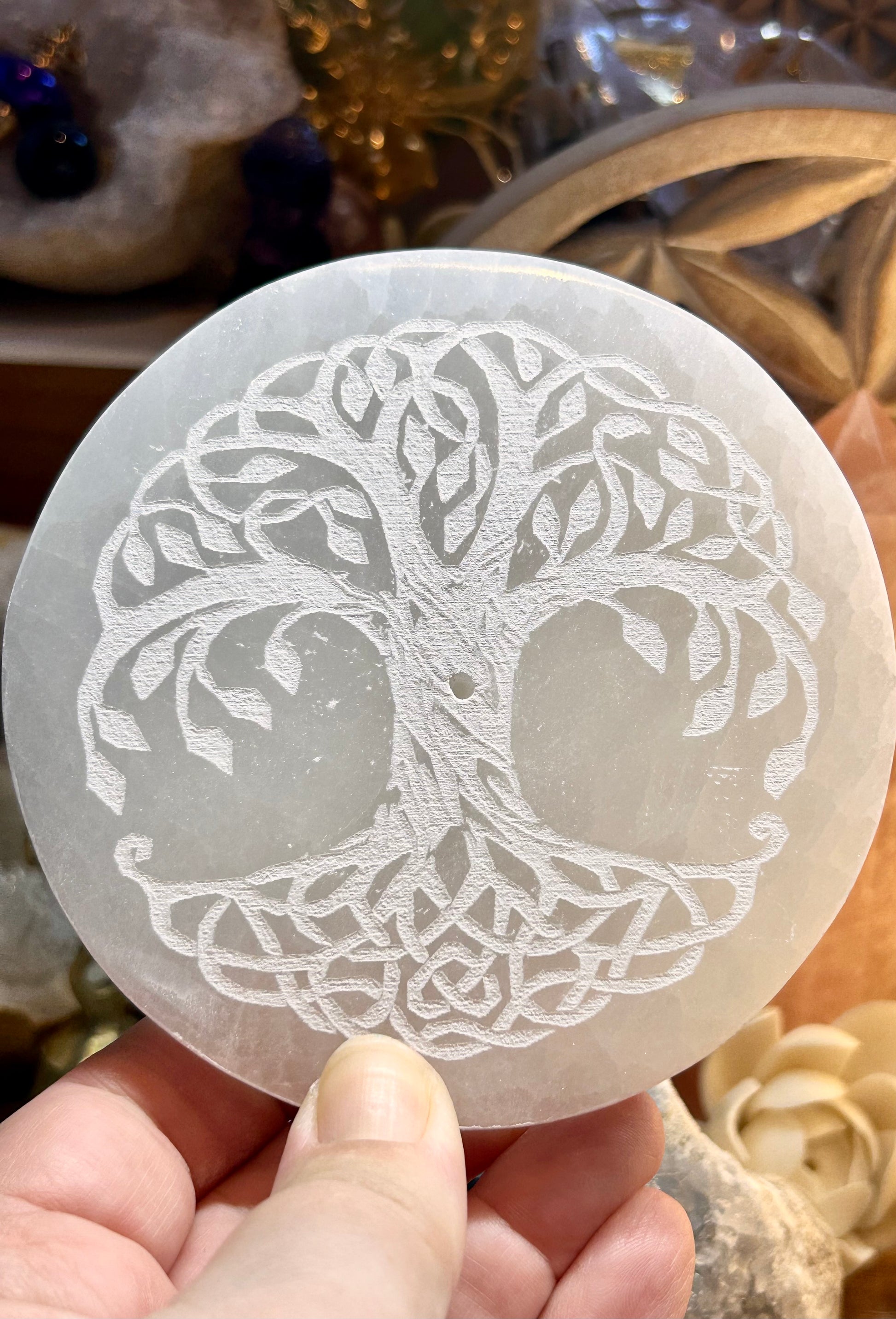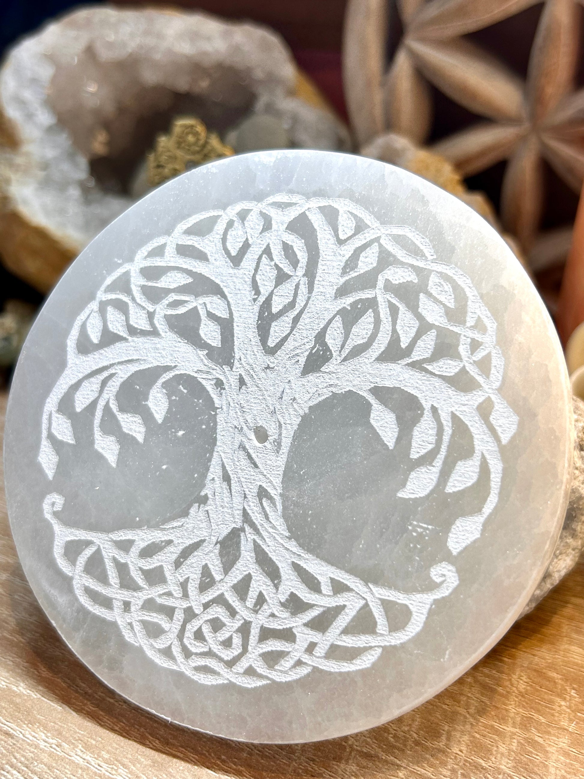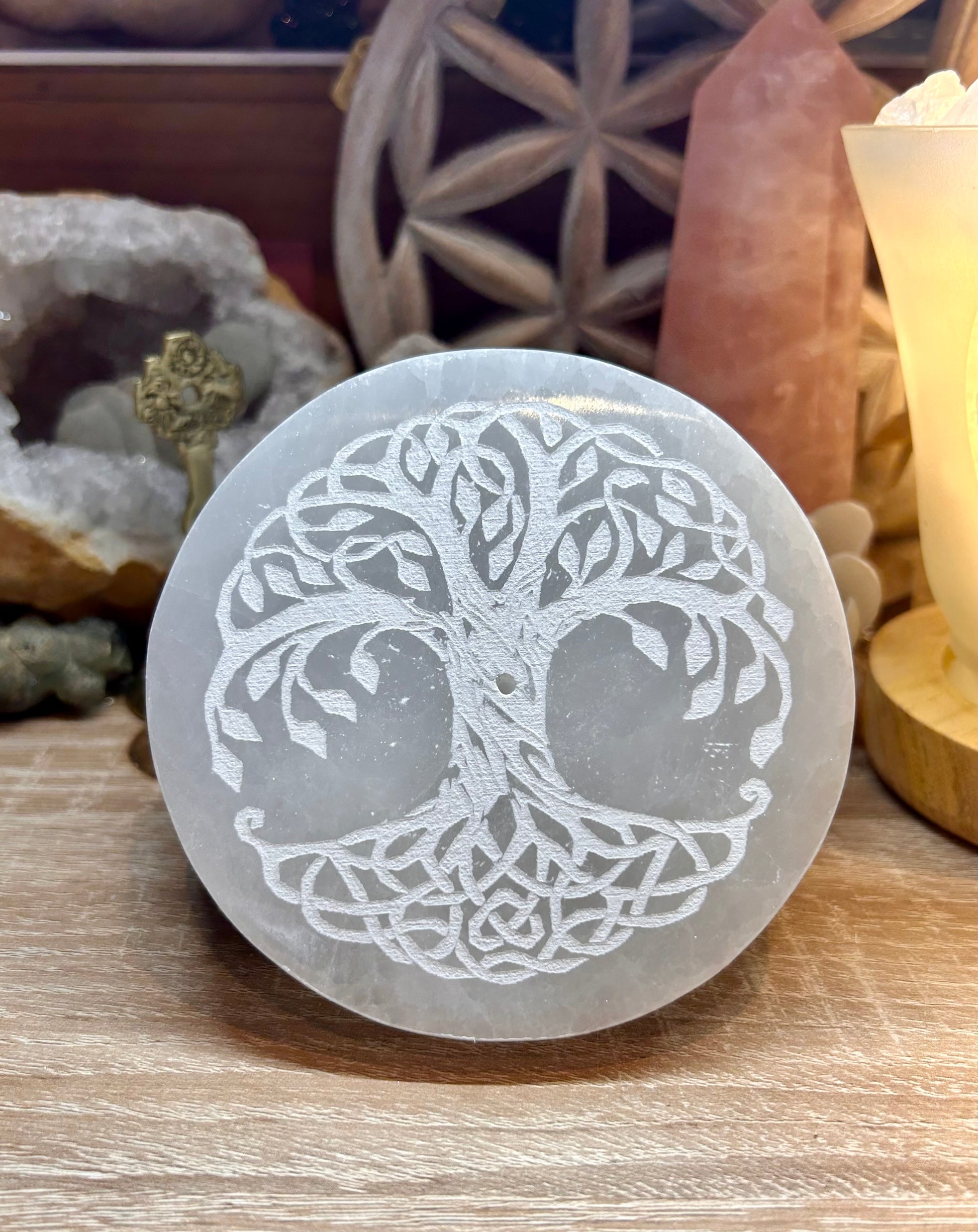 Plaque de sélénite gravée et porte-encens arbre celtique