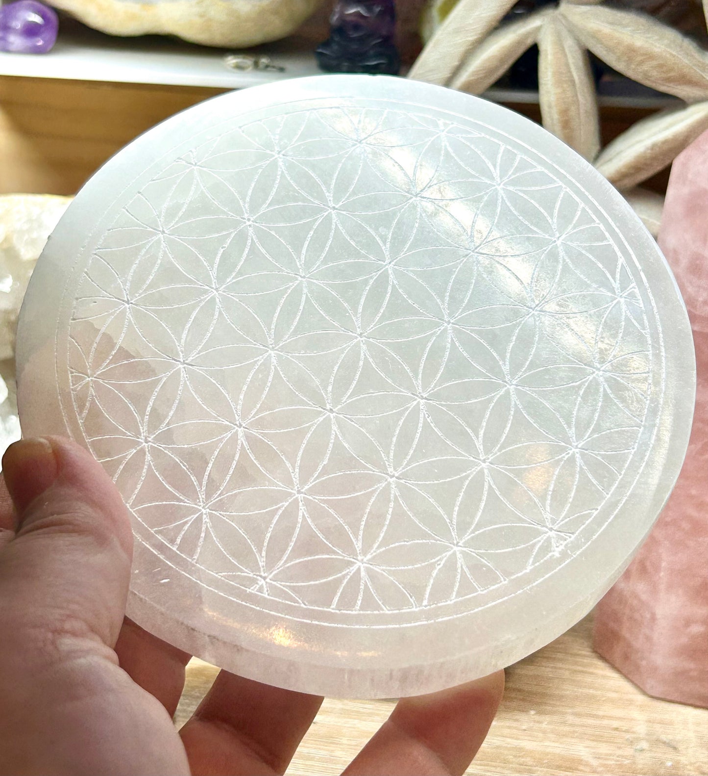 Plaque de sélénite gravée fleur de vie 12cm