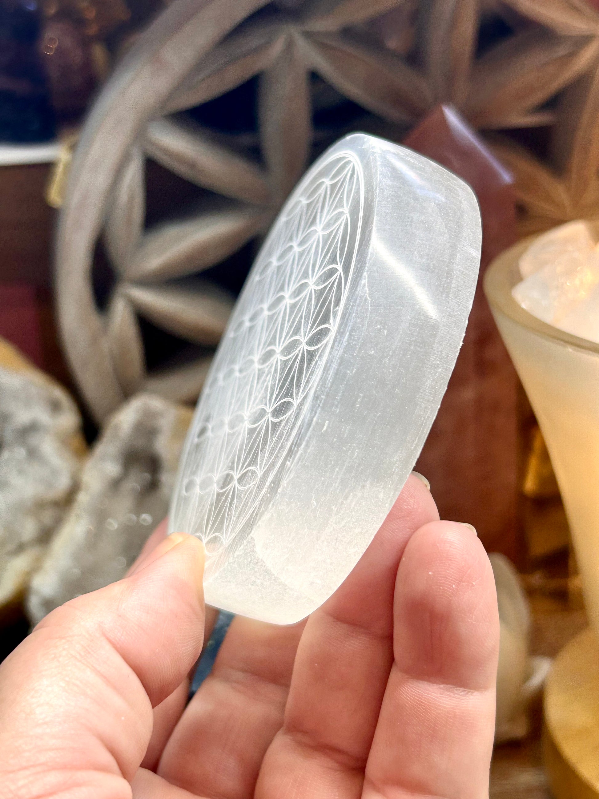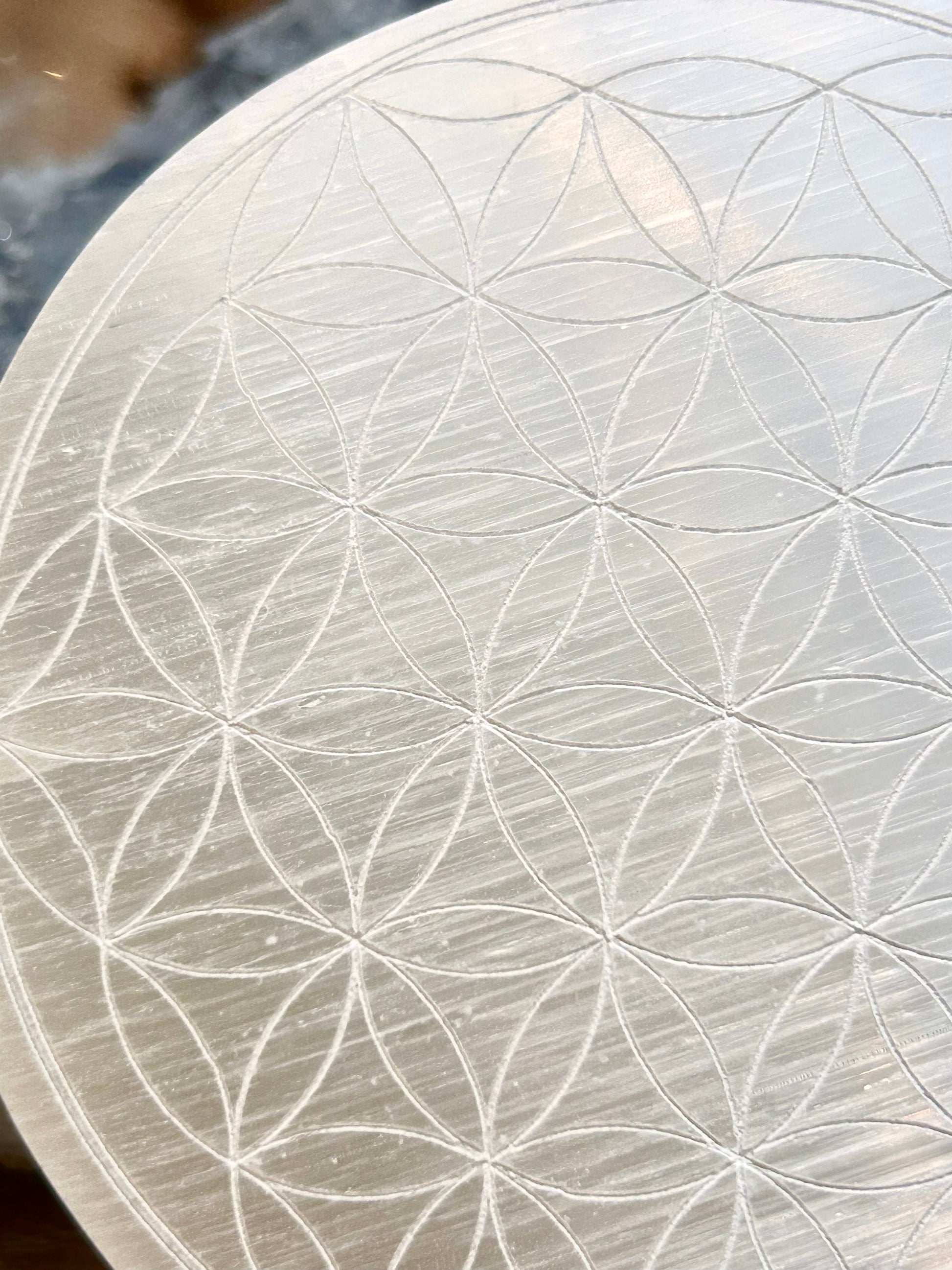 Plaque de sélénite gravée fleur de vie