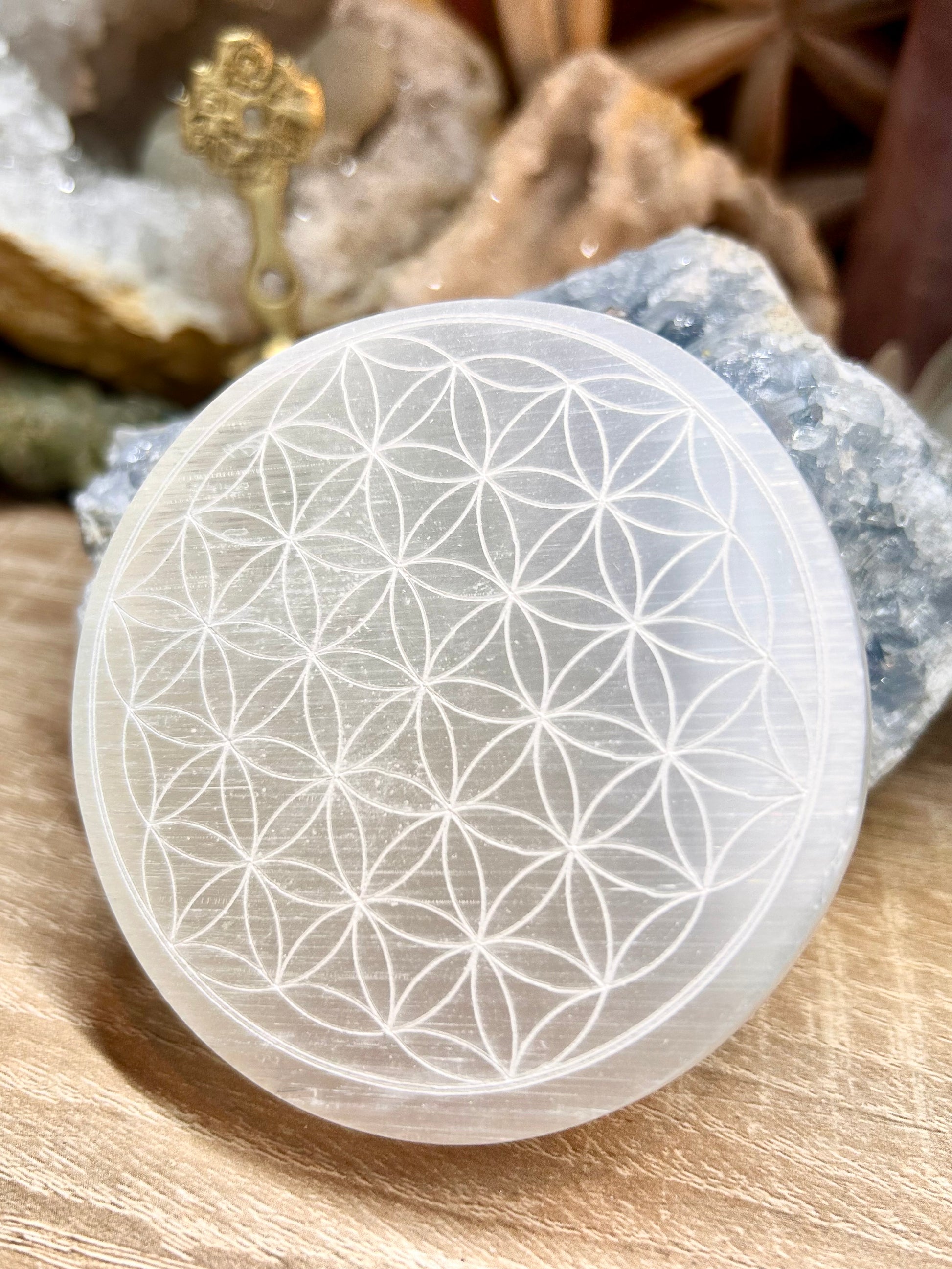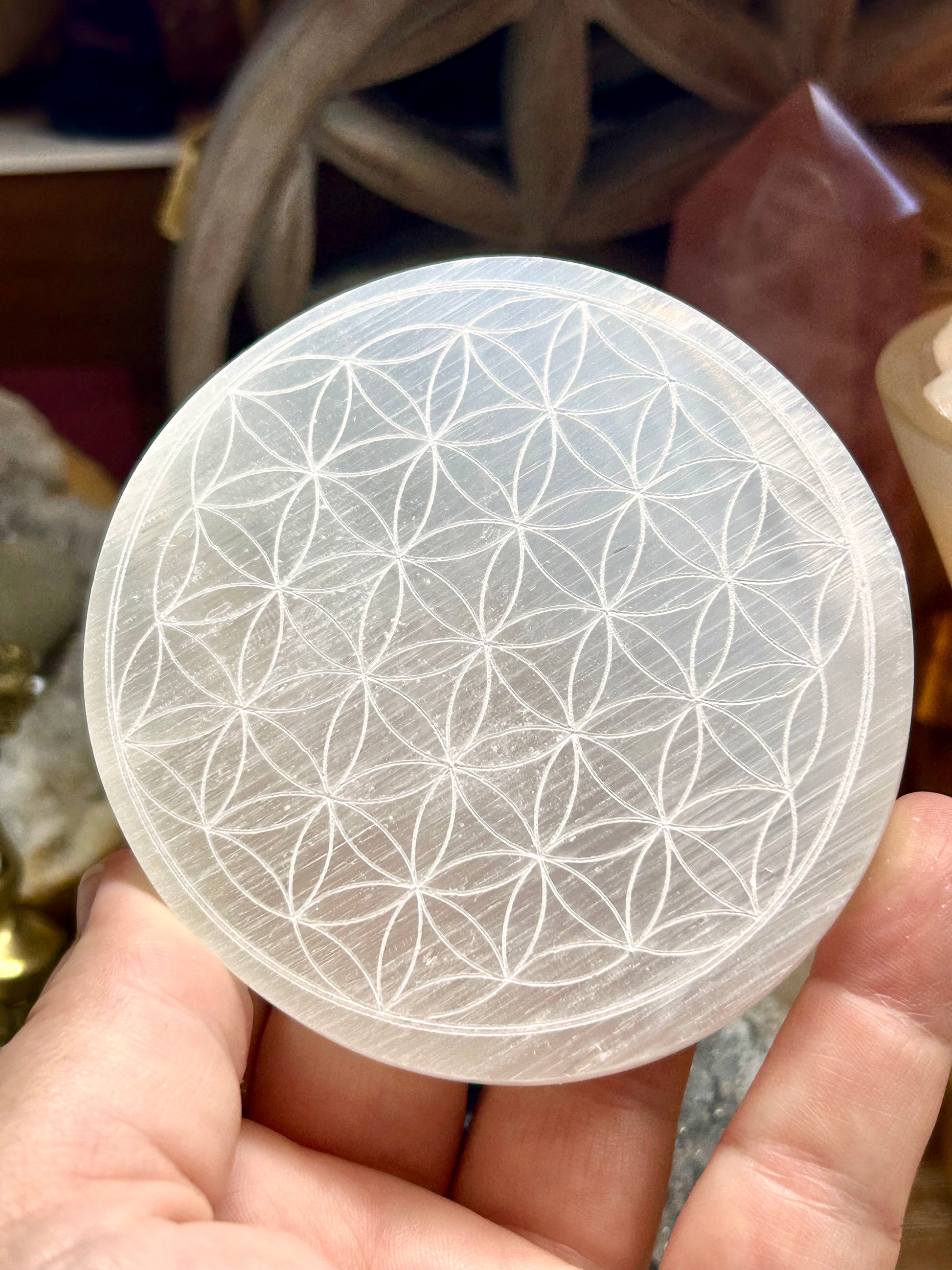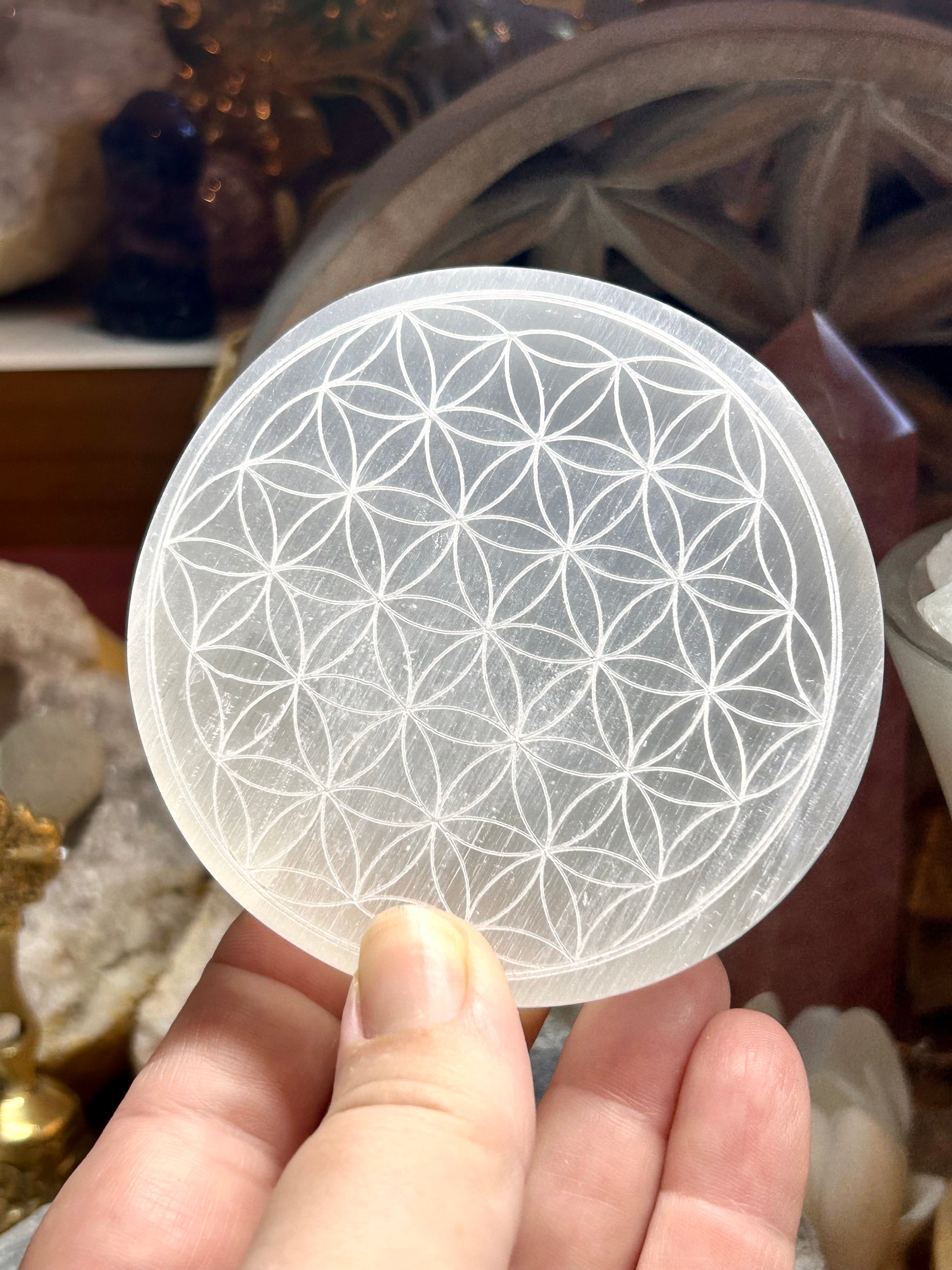 Plaque de sélénite gravée fleur de vie 8cm