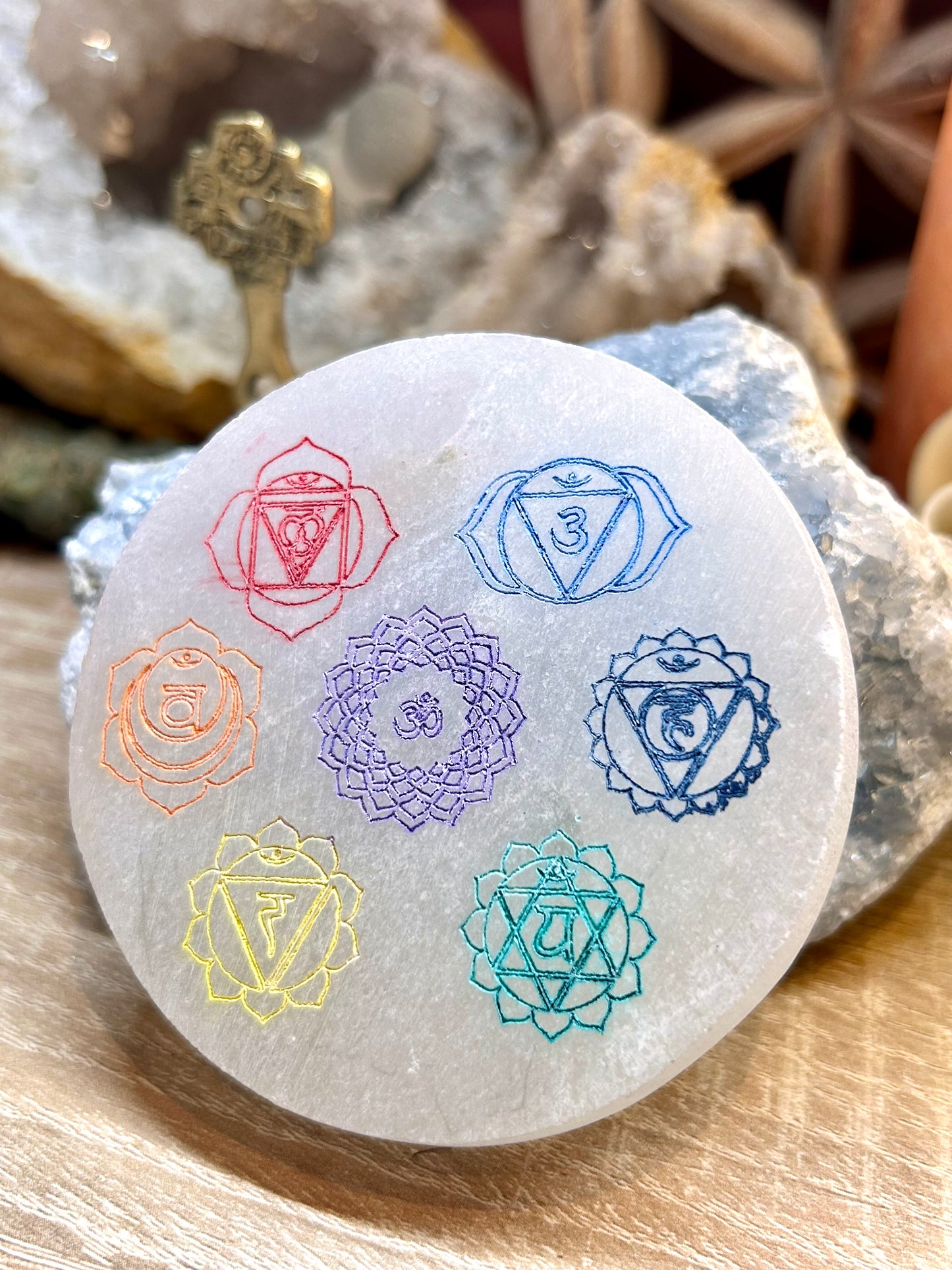 Plaque en sélénite gravée des symboles chakras avec leurs couleurs