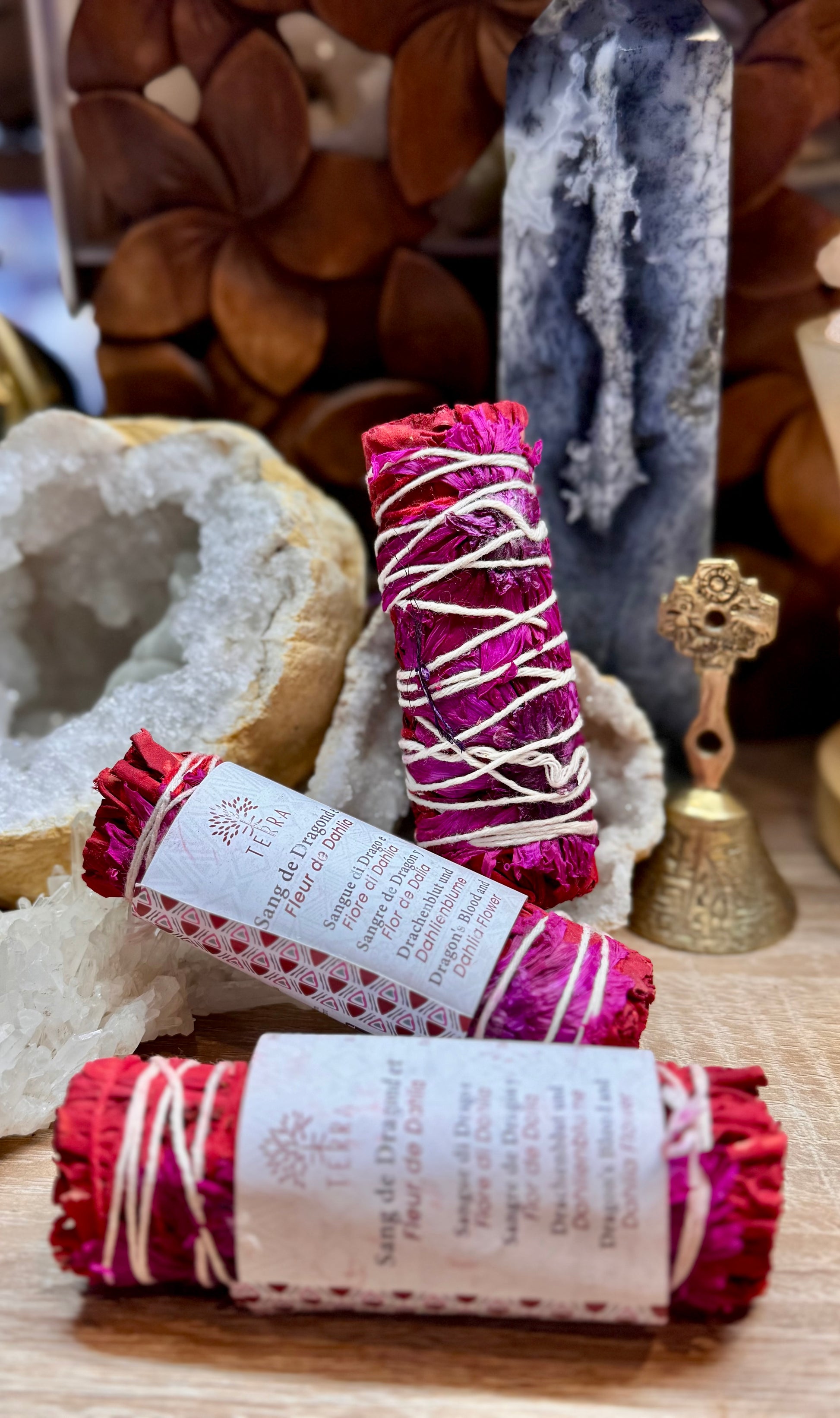 Feuilles de sauges blanches trempées dans la résine de sang de dragon.