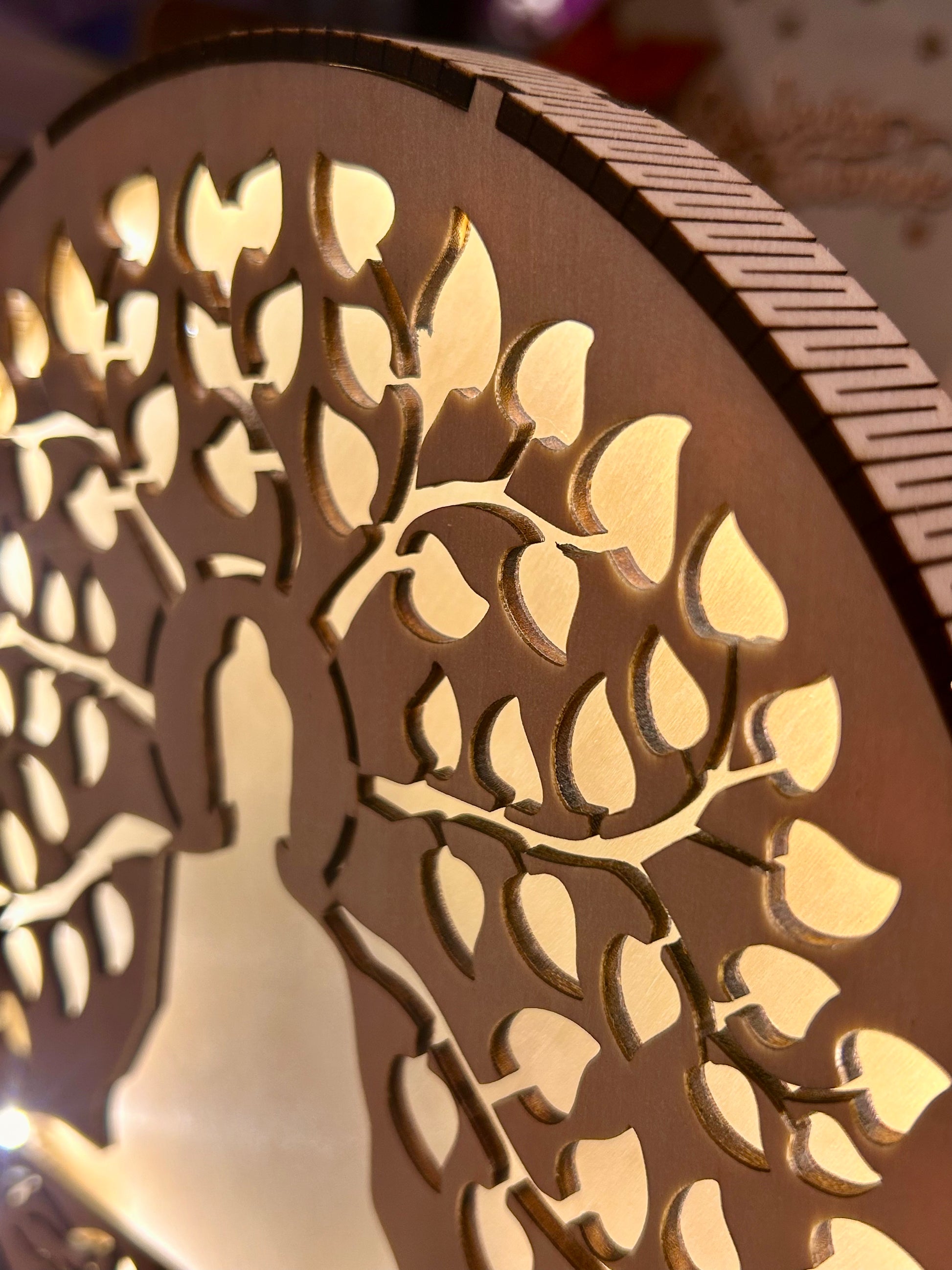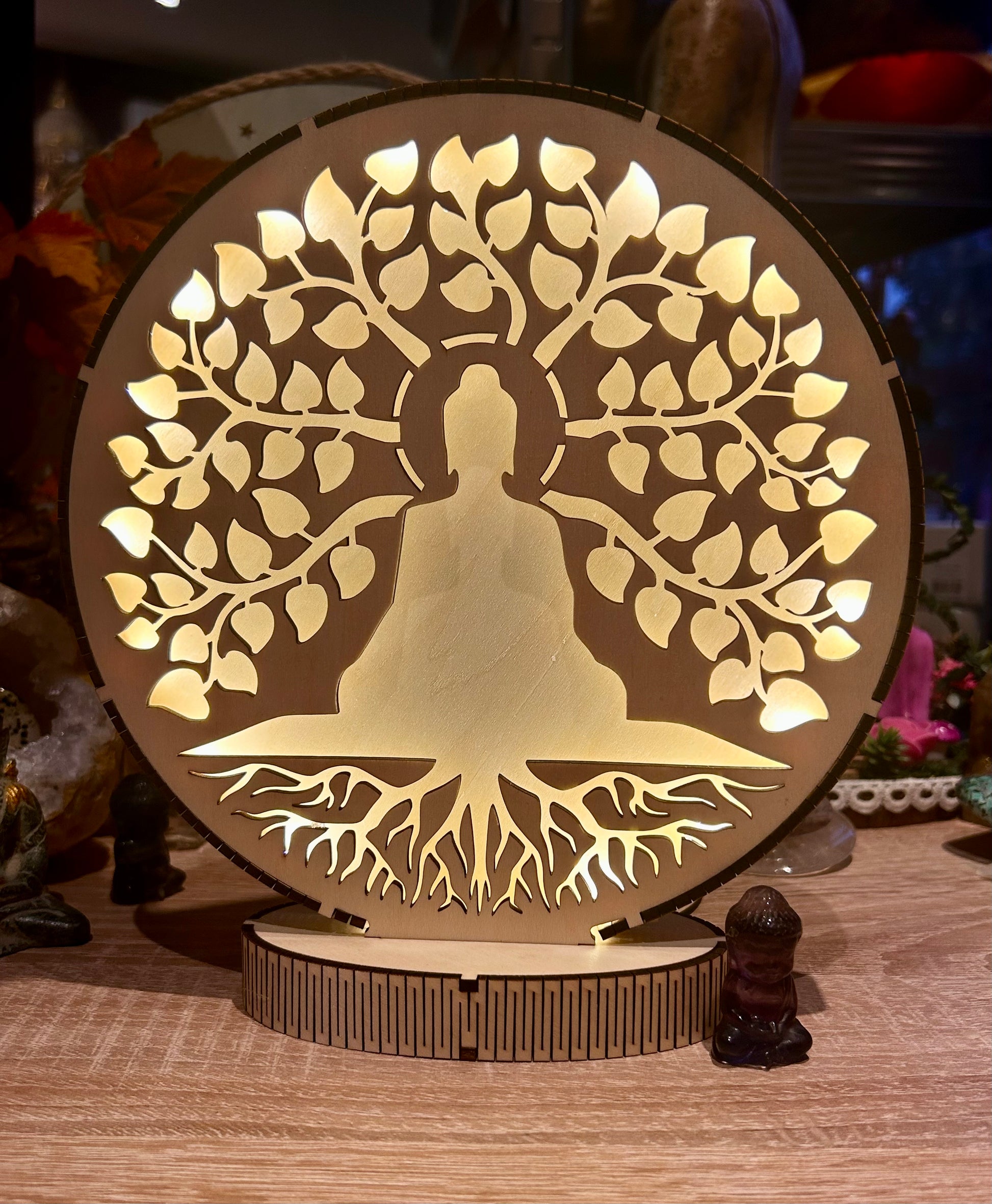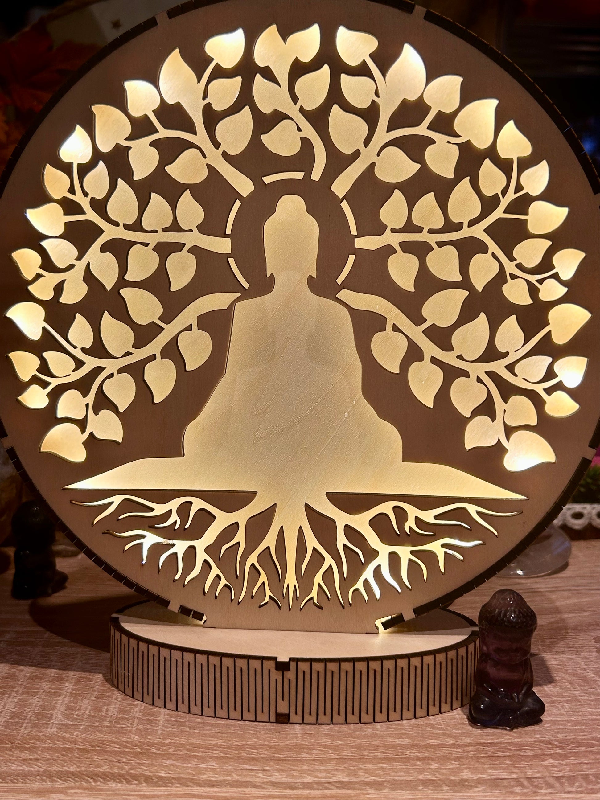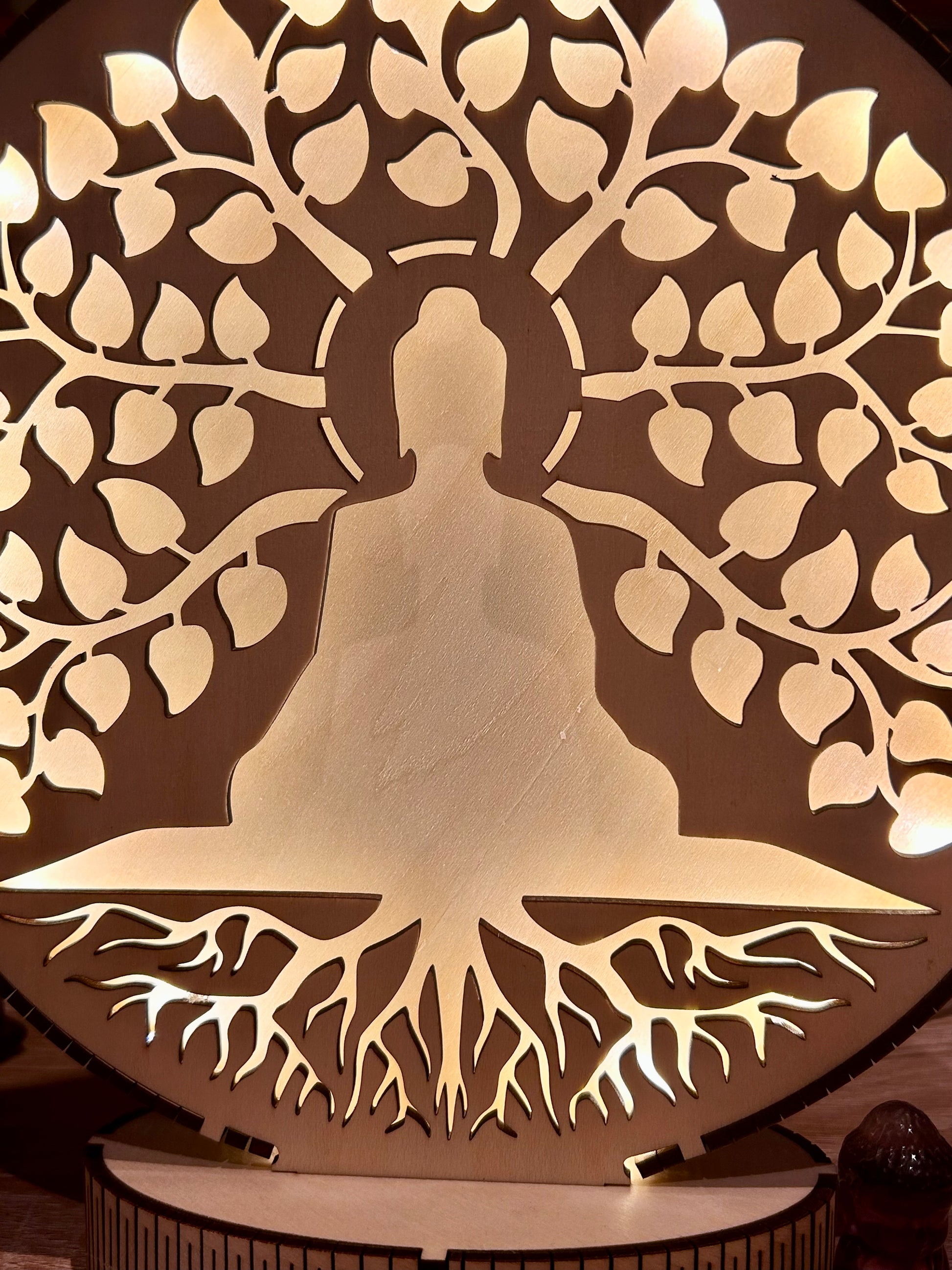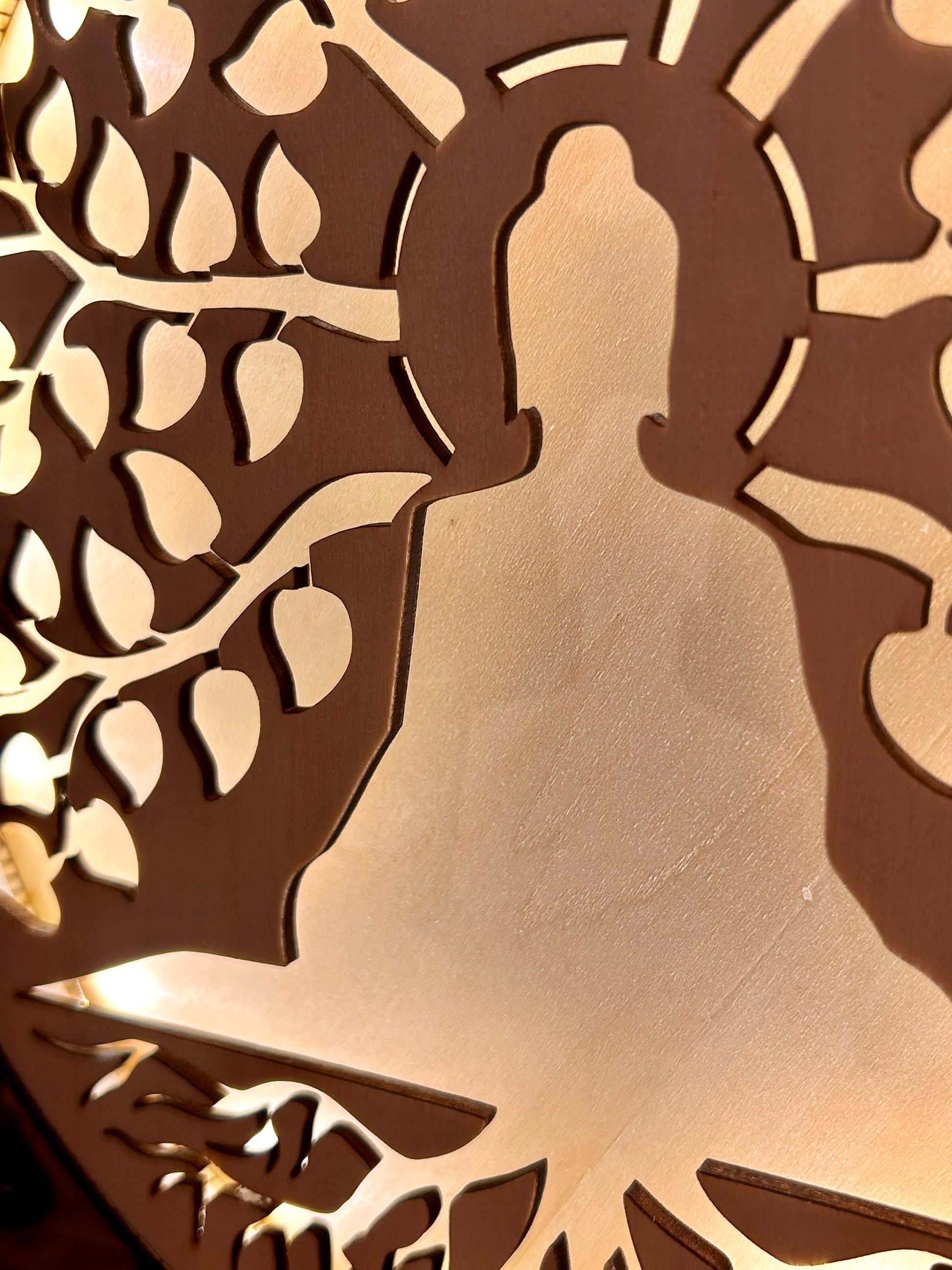 Silhouette lumineuse d’un bouddha au pied d’un arbre